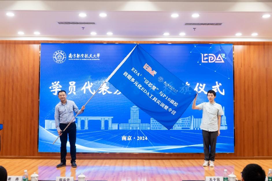 随后,余天洋博士作为本期夏令营学员代表进行发言,由EDA²外部合作委员会主任郑云升先生授旗,“议芯堂”与P10高校首期多元化EDA工具实训夏令营正式全面启动。